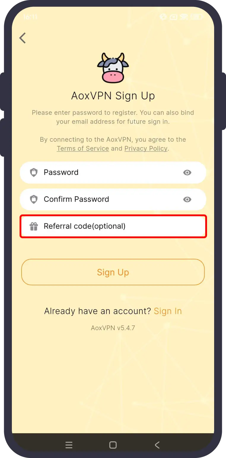 Download and open the app → tap the "Profile" icon → then tap "Sign In/Sign Up" button.